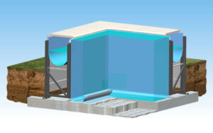 Per il re-interro viene utilizzata solo il materiale di riporto o di risulta dello scavo, senza la necessità di dover utilizzare materiale inerte e realizzare costose opere di consolidamento in muratura attorno alla struttura della vasca. La struttura autoportante permette poi la realizzazione della piscina senza creare pesanti opere murarie, che in questo caso si riducono alla sola realizzazione del basamento in cemento armato.