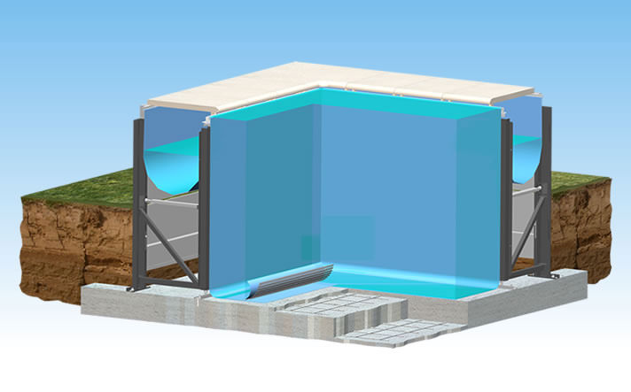 La struttura della piscina seminterrata a Skimmer è concepita per essere montata su di un piano in cemento o pavimentato liscio; con portata minima di 1300 Kg/m2. Per il montaggio in altre situazioni, ad esempio spiagge, sono disponibili kit aggiuntivi.