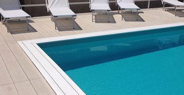 Bordo Design in plastic wood 100% riciclabile, resistente ai raggi UV, impermeabile, indeformabile e antiscivolo; disponibile nei colori Provence, Columbia, Algarve e Montana e Bordo Nature Stone bordo perimetrale in cemento e graniglia di marmo ricostruito disponibile nei colori Grigio Antracite, Bianco e Giallo.