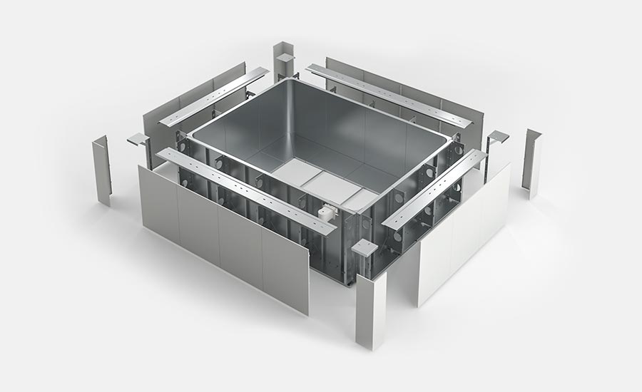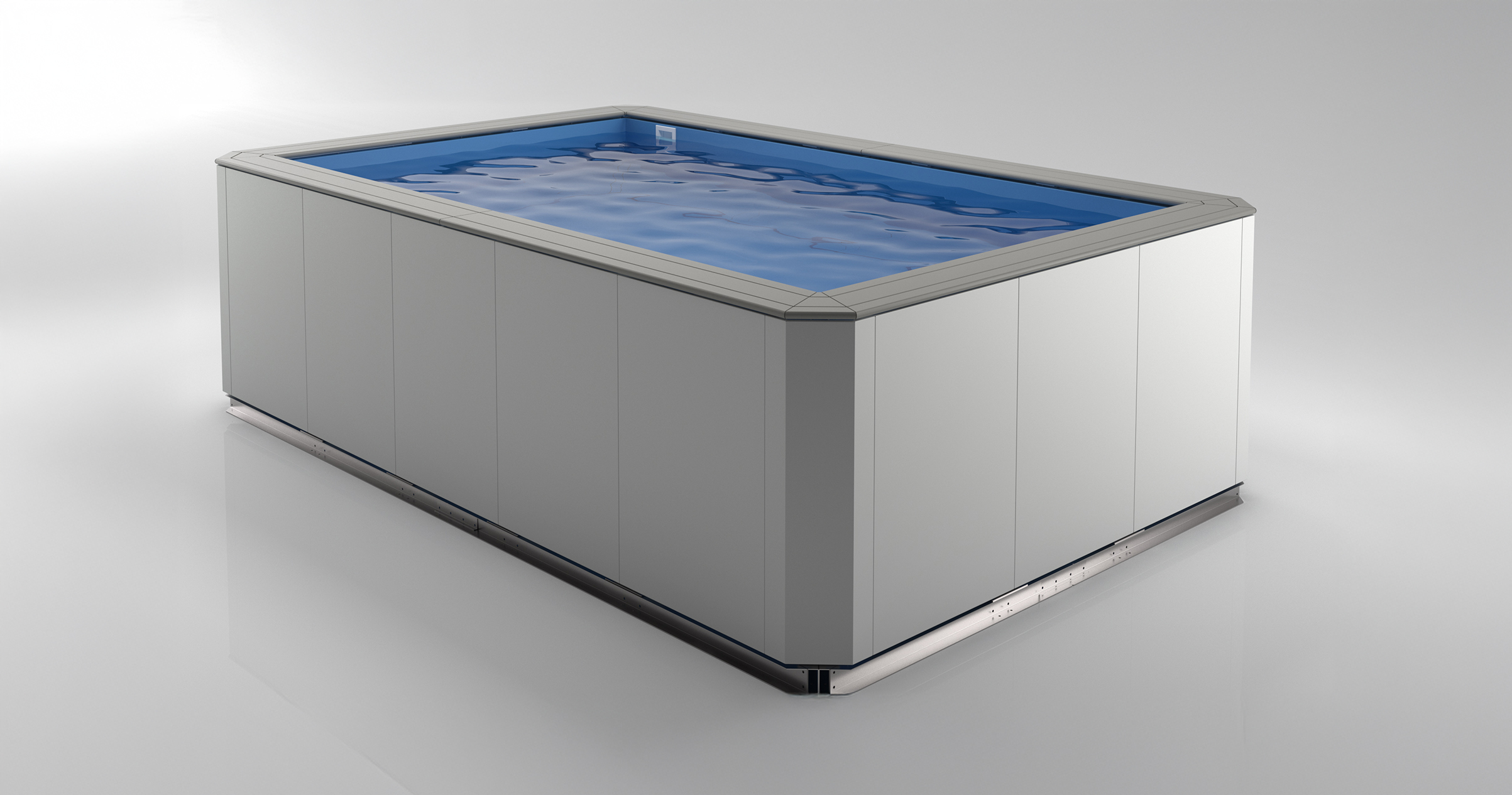 Piscina Multifunzione Autoportante, realizzata in pannelli spessi 2 millimetri e larghi 900 zincati a caldo con il sistema SENDZIMIR, viene rivestita in PVC saldato in opera, che ne garantisce la durata negli anni e una perfetta finitura estetica. Il rivestimento interno può essere in lamiera biplastificata bianca o in WPC. Il rivestimento esterno è in lamiera biplastificata bianca.
