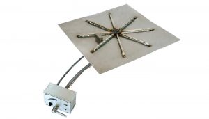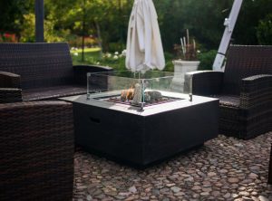 Tavolino quadrato con fuoco a gas per uso outdoor, realizzato in cemento alleggerito e rinforzato con fibra di vetro. Bruciatore in acciaio inox con accensione elettronica, regolatore dell’intensità di fiamma e termocoppia di sicurezza.